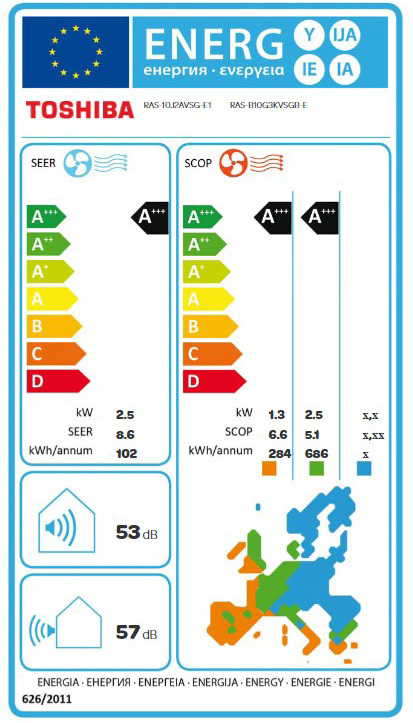 - SCOP (Εποχιακός συντελεστής απόδοσης) αντιπροσωπευτικός για ολόκληρη την εποχή θέρμανσης.Ορίζεται ως λόγος της ετήσιας απαιτούμενης θέρμανσης προς την ετήσια κατανάλωση ηλεκτρικής ενέργειας (η ετήσια κατανάλωση θέρμανσης βασίζεται σε 1400 ώρες λειτουργίας). Ενδεικτικά για ένα κλιματιστικό Α κλάσης και άνω ο δείκτης SCOP είναι από 3.40w/w μονάδες και πάνω.